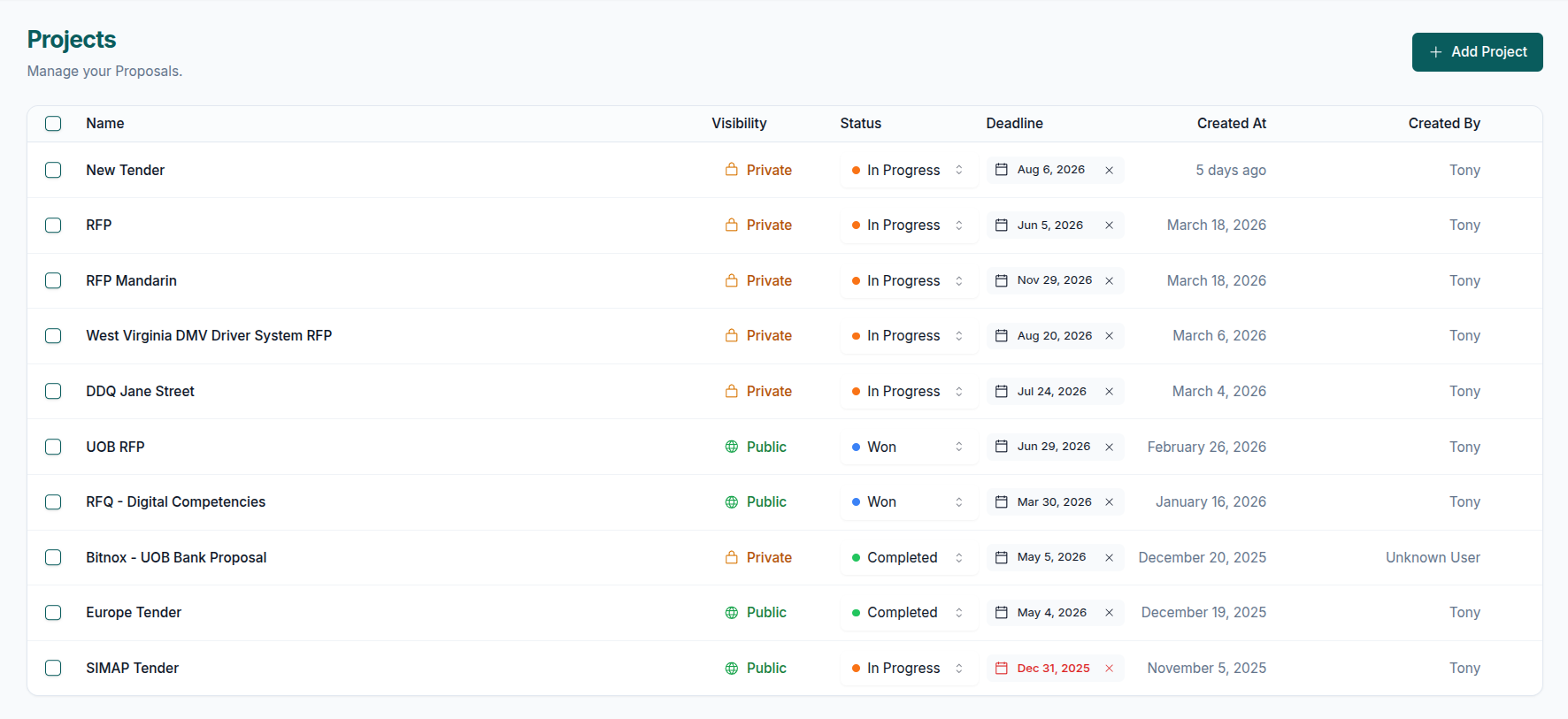 Projects are dedicated workspaces for managing RFP responses from start to finish. Each project contains uploaded documents, extracted questions, generated responses, and team collaboration tools.