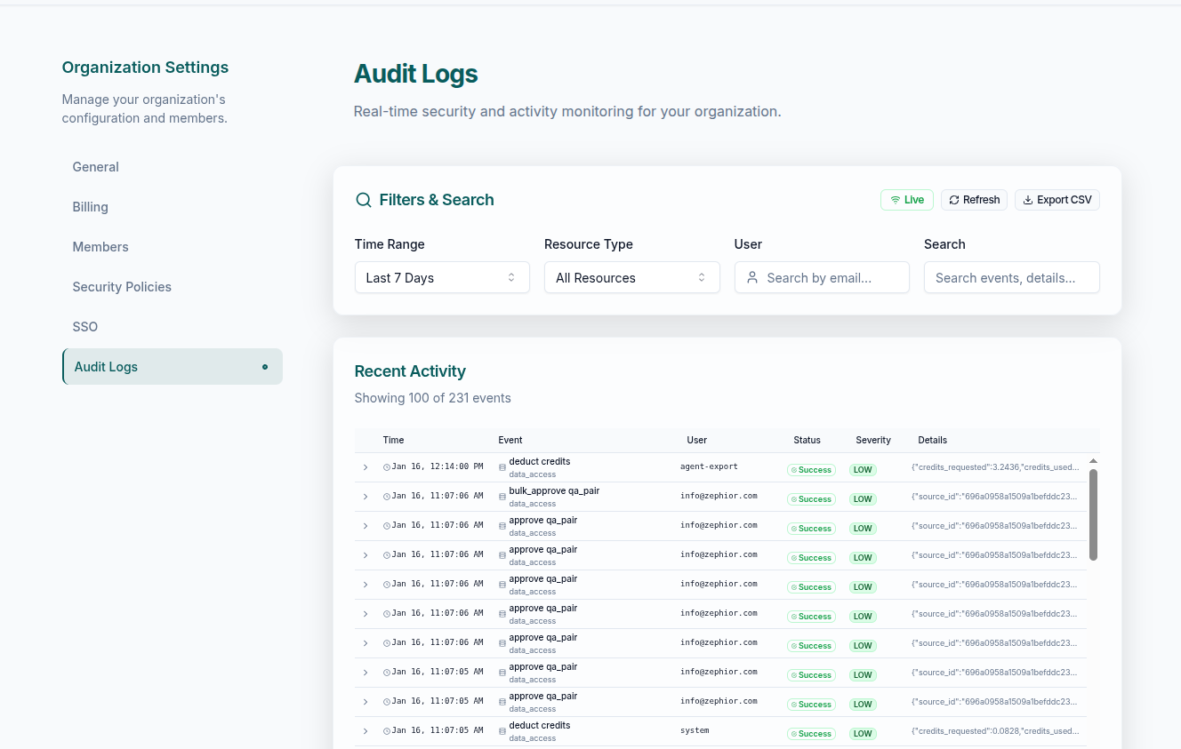 Export audit logs as CSV for compliance documentation, security audits, or external analysis.Exports are rate-limited to 10 per 24 hours per organization. Each export includes all event types for the selected time range.