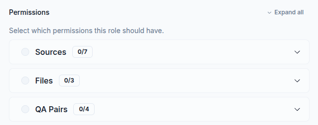 Access levels can only include permissions from the Sources & Files, Q&A Pairs, and Features categories. Organization, Billing, and Audit permissions can only be assigned through roles.