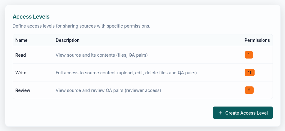 Create custom access levels when the defaults don’t match your needs — for example, a level that allows file uploads but not Q&A management.Access levels can only contain source-related permissions. Organization-level permissions (settings, billing, audit) can only be assigned through roles.